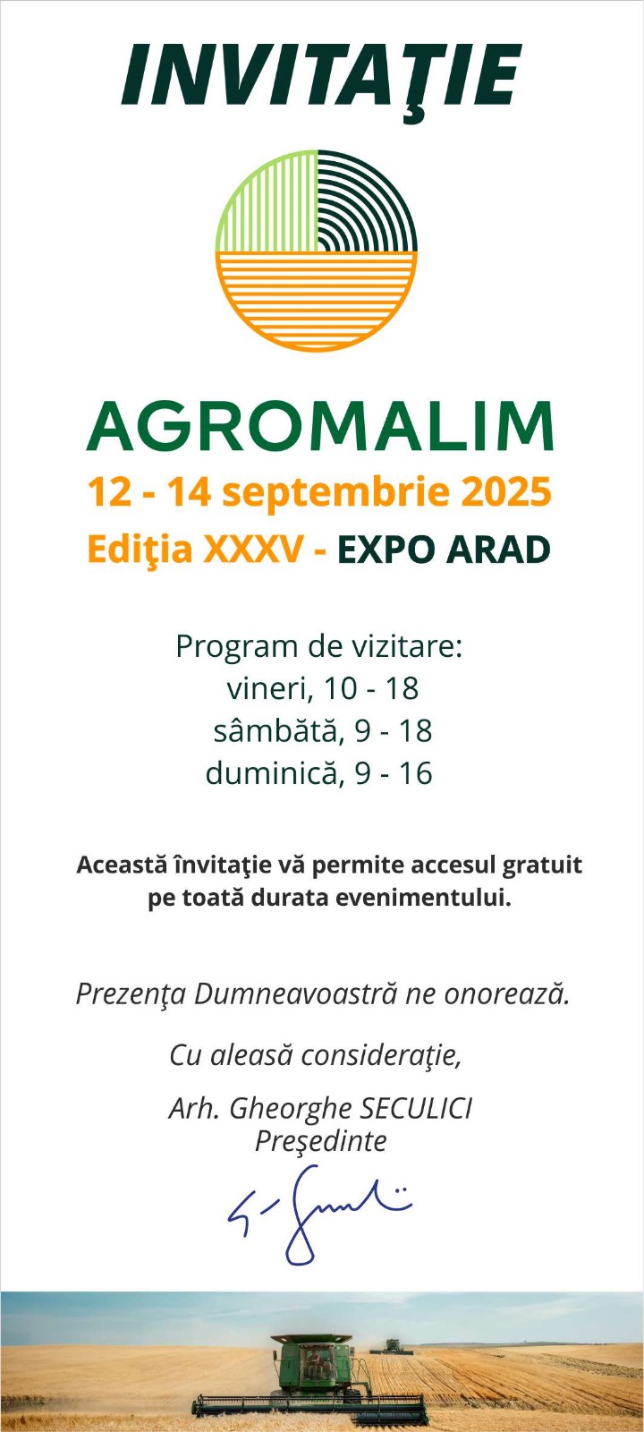 AgroMarket Comănița a primit invitație la târgul AGROMALIM din Arad, care s-a desfășurat în perioada 12-14 septembrie 2025. Invitația a fost onorată prin participarea reprezentantului asociației.